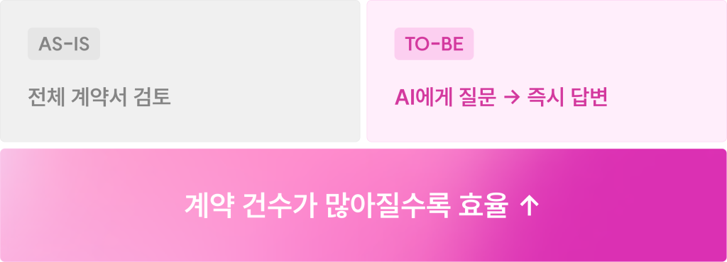 조항 하나 확인하려고 수백 장의 PDF 파일을 일일이 열어보던 비효율에서 벗어나세요. 이제 AI에게 필요한 조건만 물어보면 수만 건의 계약 데이터 중에서 원하는 답을 즉시 얻을 수 있습니다.