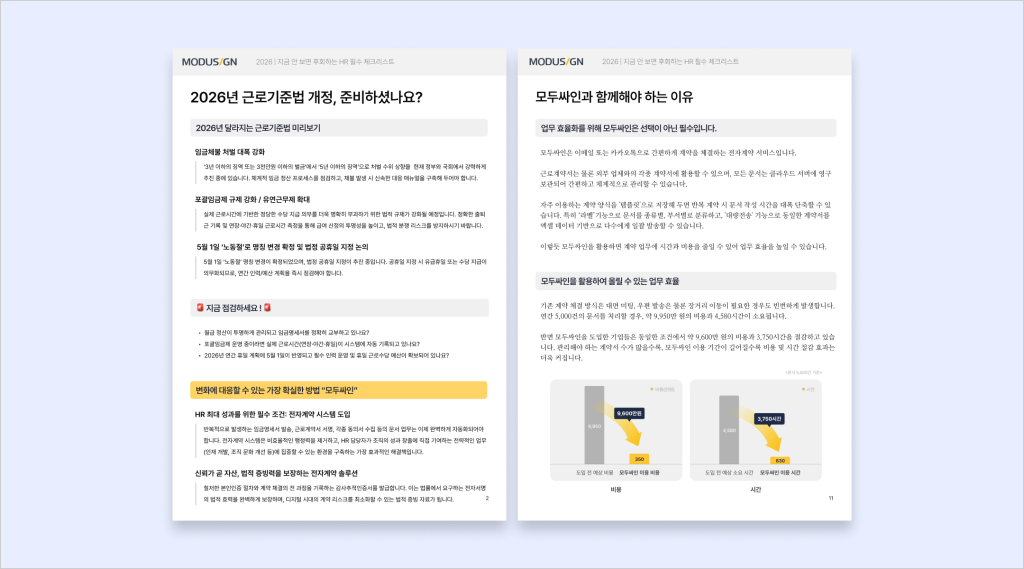 모두싸인 2026 HR 백서-요약본은 근로기준법 개정 내용의 핵심만 선별해, HR 실무자가 빠르게 확인할 수 있도록 구성했습니다.