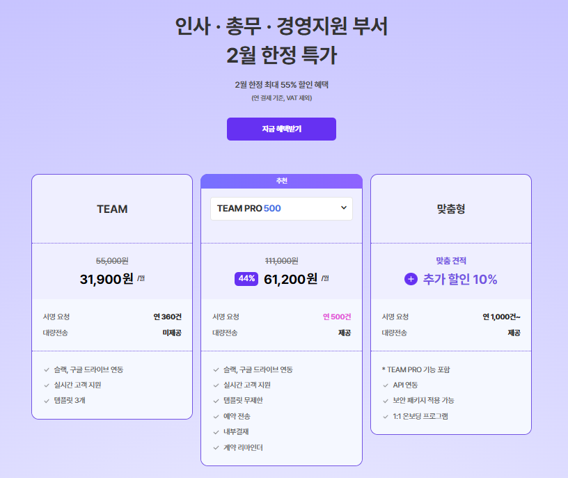– 해당 페이지 내 명시된 ‘최대 55% 할인’은 TEAM PRO 1000 연 요금제 기준, 기본 할인과 추가 할인 쿠폰을 모두 적용한 할인율입니다.