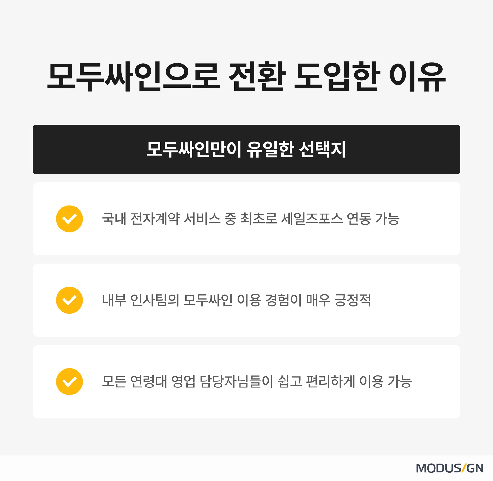 A. 모두싸인만을 타겟으로 하고 문의를 드렸습니다. 모두싸인은 국내 최초로 세일즈포스 패키지를 제공하기도 했고, 내부 인사팀에서 사용하셨던 적이 있어서 저 또한 모두싸인에 대한 이용자 경험이 너무 좋았죠.