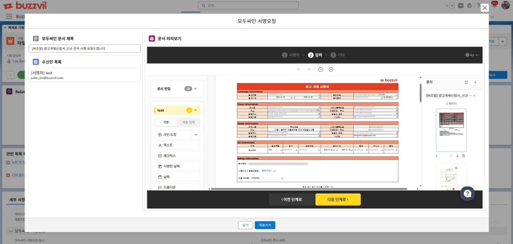 버즈빌 영업팀에서는 기존에 사용하던 타 전자계약 서비스를 대체할 새로운 플랫폼 도입에 대한 요청이 지속되었고, 세일즈포스 기반의 영업 조직에는 더 최적화된 방식이 필요했습니다.