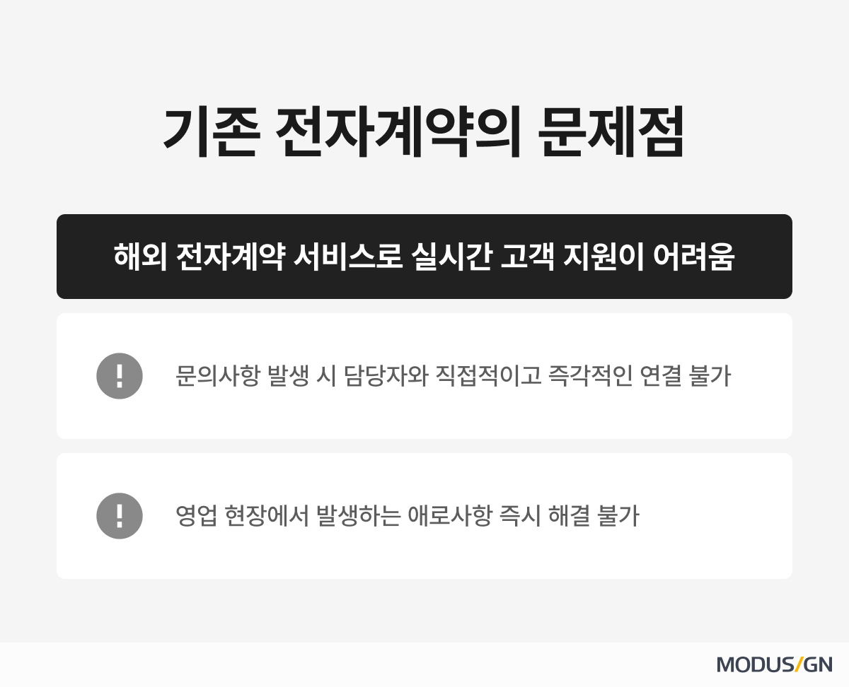 A. 저희는 이전에 해외 전자계약 서비스를 사용했습니다. 당시에는 국내 전자계약 중 세일즈포스 연동이 가능한 서비스가 없었다고 들었어요. 가장 아쉬움이 컸던 부분은 기능도 기능이지만 ‘고객지원’이었습니다. 해외에 본사를 두고 있는 특수성 탓에 문의사항 발생 시, 담당자와 직접적이고 즉각적인 연결이 어려울 때가 종종 있는 등 영업 현장에서 발생하는 애로사항들을 빠르게 해결하기가 어려웠습니다.