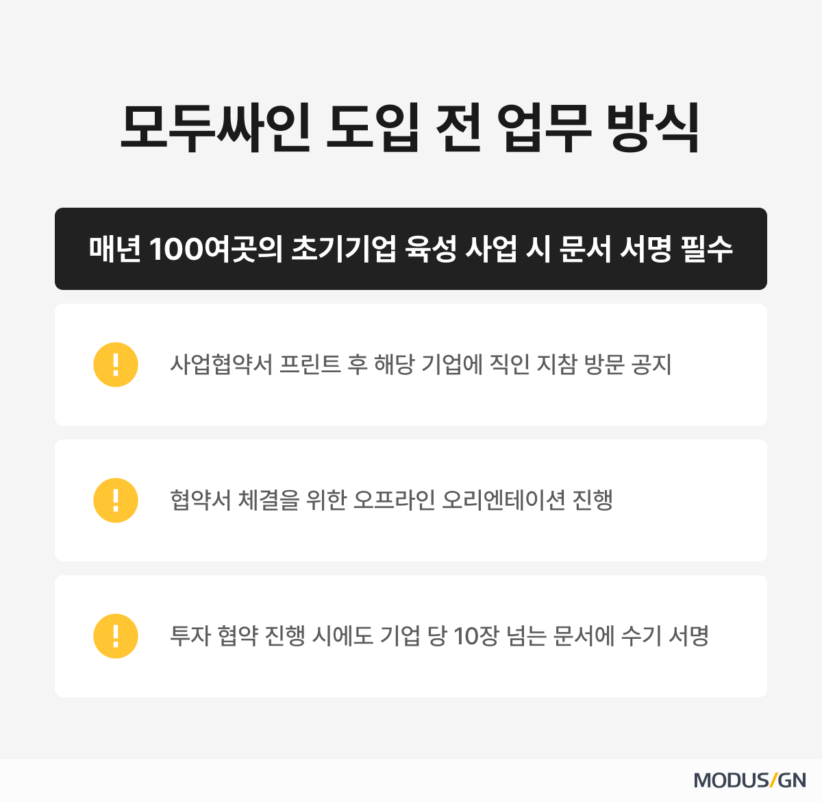 - A. 김성수 매니저님: 저희는 매년 100개사 정도를 발굴하고 육성합니다. 그럼 그게 맞는 다양한 사업들이 쏟아져 나오죠. 이런 사업 운영과 참여를 위해 협약 체결이 기본 베이스에 깔려 있습니다. 모두싸인을 알기 전에는 사업협약서를 프린트 해둔 후, 기업들에게 직인을 가지고 오라고 방문 공지 드리고, 수기로 직인을 날인하고 보관하는 과정들을 반복했습니다. 20개사를 선정해서 진행하는 프로젝트라고 했을 때 그 기업들과 협약을 다 맺으려면 그날 하루는 오리엔테이션을 진행하면서 협약 체결을 해야 했습니다.