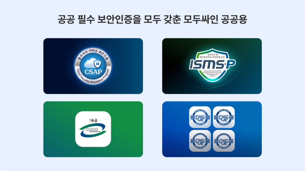 과장님: 네, 공공기관은 보안이 정말 중요합니다. 모두싸인 공공용 서비스가 CSAP를 포함하여 기관 보안 관련 인증들을 빠르게 취득했다는 점이 신뢰를 주었어요. 그리고 저희와 같은 기관들은 경영 평가를 받는데 보안 인증 기반의 클라우드 서비스를 도입하면 평가에도 가점이 부여될 수 있다는 점도 중요한 고려 요소였습니다.