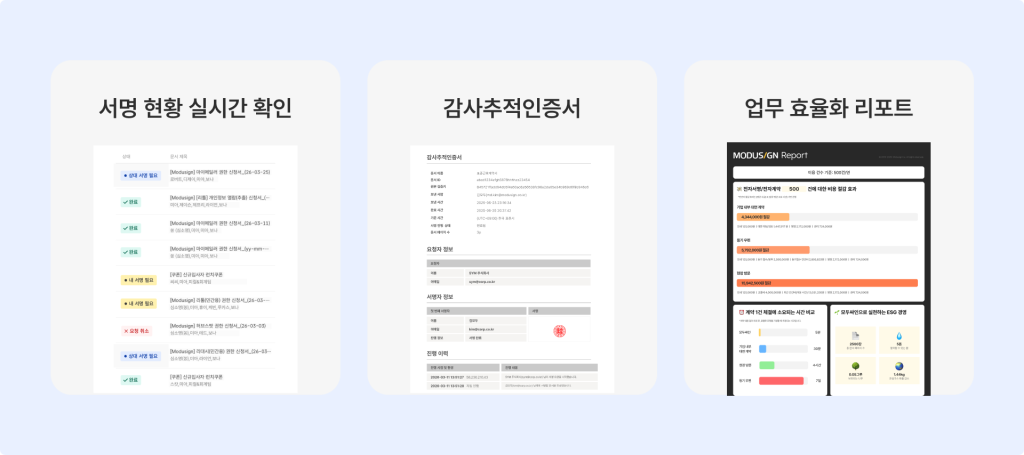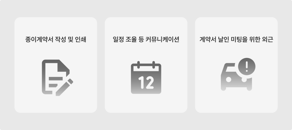 대리님: 저는 서명 전의 행정 절차들이 통째로 생략됐다는 게 가장 큰 변화예요. 이전에는 상대방 일정 조율, 이동, 날인, 스캔, 보관까지 단계마다 사람 손이 필요했는데 이제는 링크 하나로 시작해서 완료까지 알아서 돌아가요.