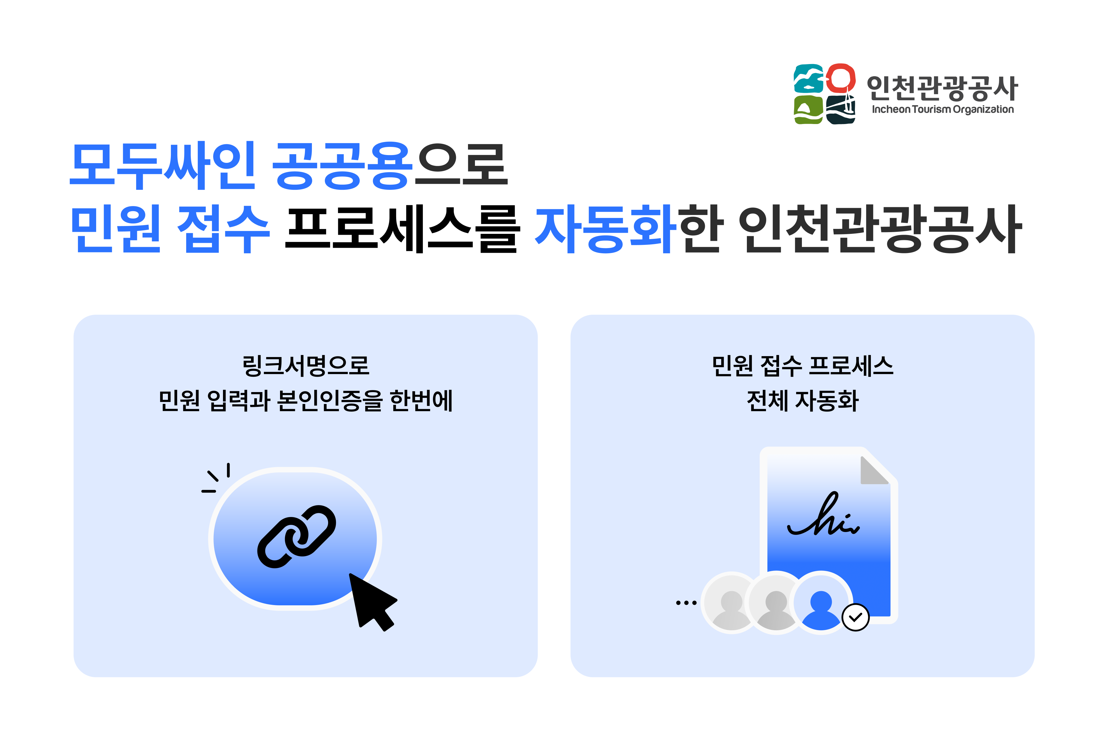 과장님: 안녕하세요. 저는 인천관광공사 상상플랫폼 운영사업팀에서 업무 자동화, 디지털 솔루션 도입을 통해 조직 전반의 업무 효율화를 담당하고 있습니다. 좋은 시스템을 발굴해서 실무에 잘 안착시키는 것이 제 역할인데요, 이전 직장에서도 비슷한 업무를 했습니다. 계약이 굉장히 많이 일어나는 환경이다 보니 자연스럽게 전자서명 솔루션에 관심을 가지게 됐습니다.