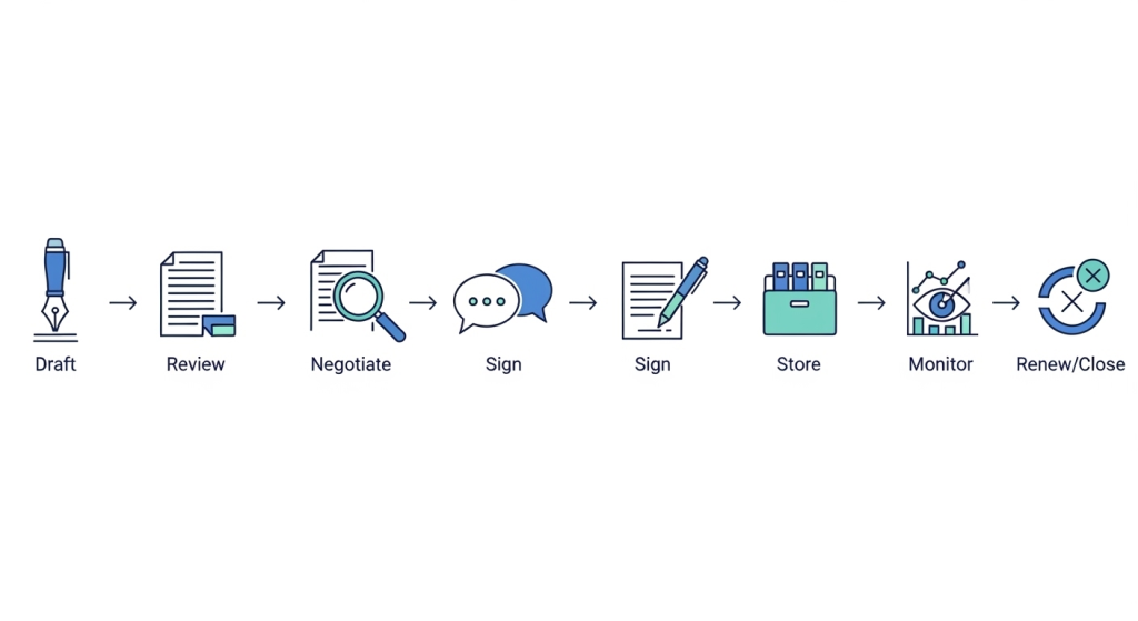 계약의 생애주기를 단계별로 보면 이렇습니다. 계약 필요성 인식과 초안 작성에서 시작해서, 내부 검토와 승인, 상대방과의 협상, 서명과 체결, 체결 이후 보관과 이행 관리, 만료·갱신·종료까지 이어집니다. CLM은 이 모든 단계를 하나의 시스템 안에서 관리합니다.