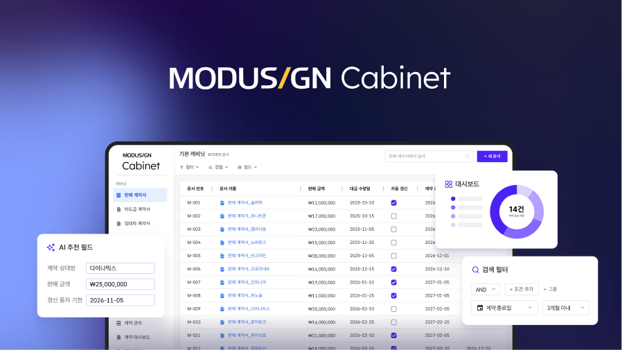모두싸인으로 체결한 계약서는 캐비닛으로 자동 연동(모두싸인 캐비닛 서비스 이용 시)됩니다. AI가 계약 정보를 자동으로 추출하고, 만료일 알림을 직접 설정할 수 있으며, 팀 단위 권한 관리와 계약서 전문 검색까지 지원합니다. 전자계약 체결부터 계약 관리까지 하나의 플랫폼에서 완결되는 구조입니다.