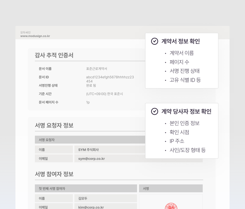 서명이 완료된 잔액확인서는 시스템에 자동 저장됩니다. 전자서명에는 서명자 정보·서명 일시·열람 이력이 자동 기록되며, 이 감사추적보고서는 회계감사 잔액조회 증빙 자료로 즉시 제출 가능합니다.