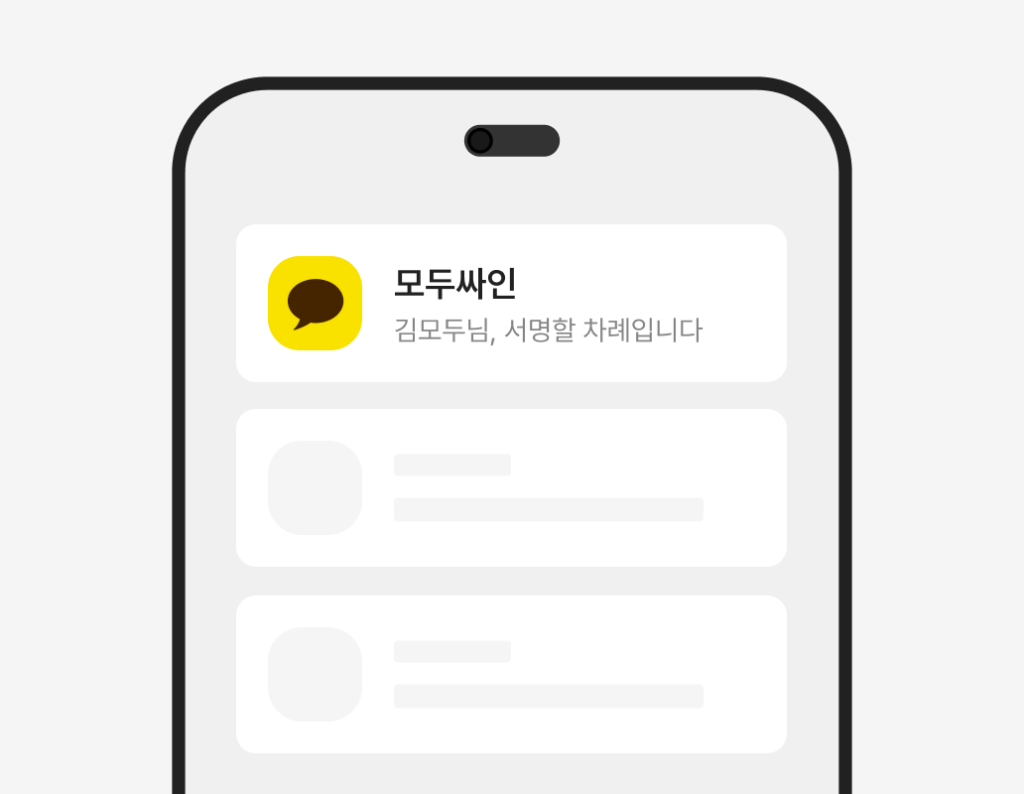 모두싸인은 잔액조회서 요청 공문을 카카오톡 알림톡으로 발송할 수 있습니다. 거래처 담당자 휴대폰에 즉시 도달하고, 수신자는 링크를 클릭해 별도 앱 설치 없이 모바일에서 바로 전자서명을 완료할 수 있습니다.