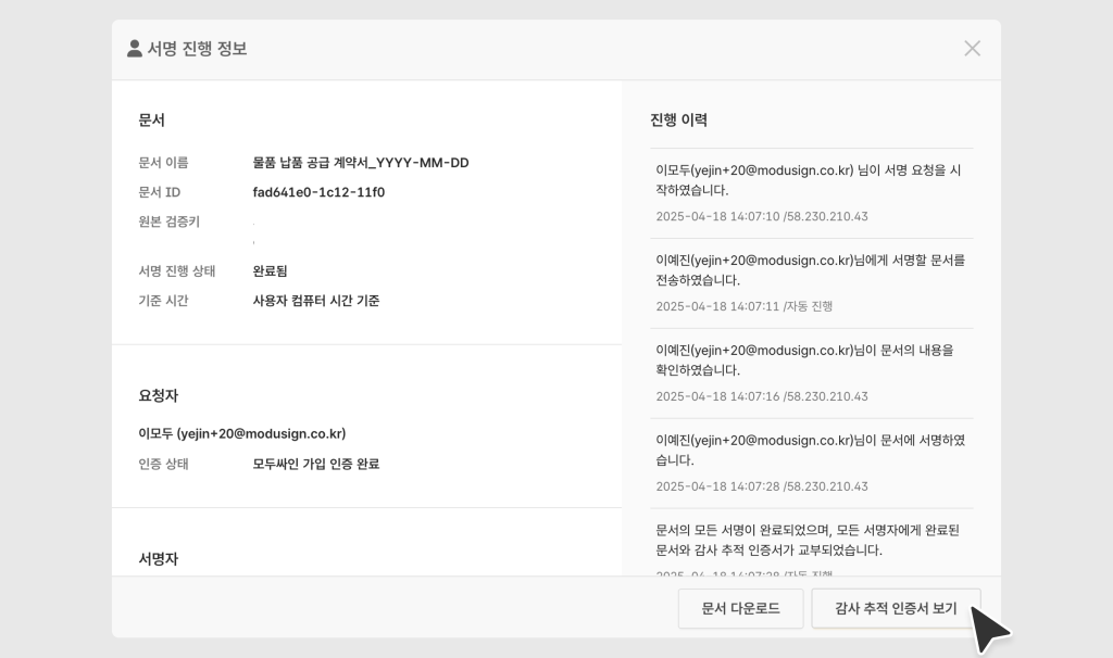 본인인증, 타임스탬프, 감사추적인증서로 서명 시점과 서명자 신원이 명확하게 기록됩니다. 종이 위임장보다 오히려 증거력이 강합니다. - 누락 및 오류 제로
