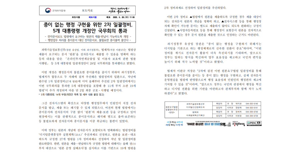 정부는 사법부뿐 아니라 공공행정 전반의 디지털 전환(DX) 을 제도적으로 뒷받침하고 있습니다. 2025년 5월, 과학기술정보통신부와 법제처는 「종이 없는 행정 구현을 위한 2차 일괄정비」를 시행했습니다. 이번 개정으로 대통령령과 부령에 ‘법령상 원본 문서도 전자문서로 제출 가능하다’는 내용이 명확히 반영되었습니다.