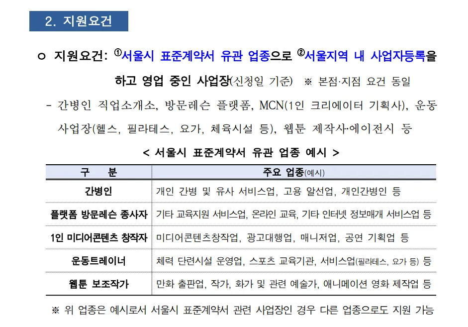 이번 지원사업은 서울시에 사업자등록을 두고 실제 영업 중인 사업장이라면 참여할 수 있습니다. 다만, 서울시가 지정한 ‘표준계약서 유관 업종’에 해당해야 합니다 .