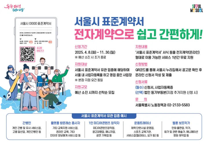 서울시는 2025년 4월 8일부터 본 사업을 공식적으로 시작하며 , 표준계약서의 보급을 확대하고 업종별 종사자들의 권익을 보호하기 위한 다양한 지원을 제공합니다. 특히 서울에 사업장을 두고 있는 기관이라면 누구나 간편하게 참여할 수 있습니다.