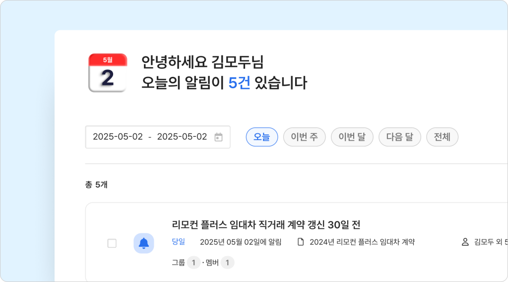 계약을 보내는 것만큼 중요한 것이 바로 관리입니다. 모두싸인은 계약 갱신, 만료, 이행일에 대한 알림을 추가하여 계약 스케줄에 대한 리마인드 메일을 수신할 수 있습니다. 이를 통해 중요한 계약의 갱신 시점을 놓쳐 발생하는 리스크를 예방할 수 있습니다. 반면 E 서비스는 이 기능을 지원하지 않아 담당자가 수기로 관리해야 합니다.