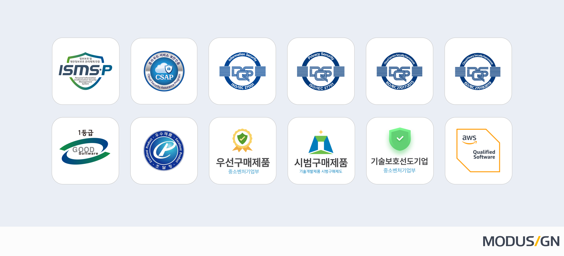 모두싸인은 전자서명 업계에서 가장 강력한 보안 체계를 갖추고 있습니다. 국내 최고 수준의 보안 인증인 ISMS-P와 CSAP 인증을 비롯해 국제 표준 ISO 인증 4종(ISO 27001, 27701, 27017, 27018)을 취득했습니다.