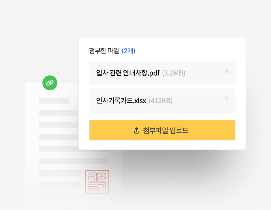 일용직 근로자의 임금 지급을 위해 신분증과 통장사본을 따로 받아 관리하는 것도 번거로운 일입니다. 계약서 내에 ‘서명자 첨부파일’ 기능을 설정해두면, 근로자가 서명 과정에서 직접 자신의 신분증과 통장 사본을 안전하게 첨부할 수 있습니다. 모든 필요 서류가 계약서와 함께 한 번에, 누락 없이 취합됩니다.