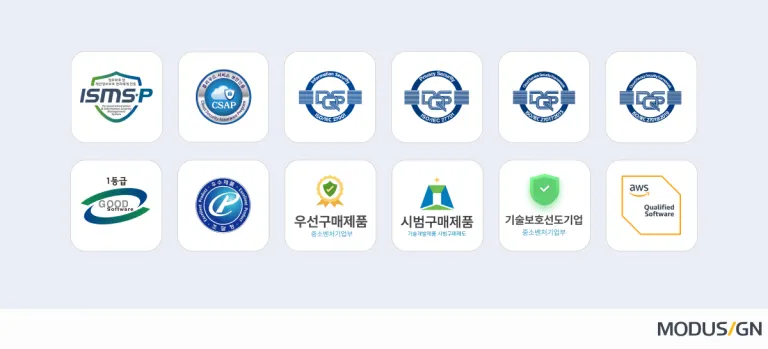 - 모두싸인은 국내 전자서명 업계에서 가장 많은 보안 인증을 취득했으며, 특히 컴플라이언스 기준이 가장 엄격한 금융권에서 널리 신뢰받고 있습니다.