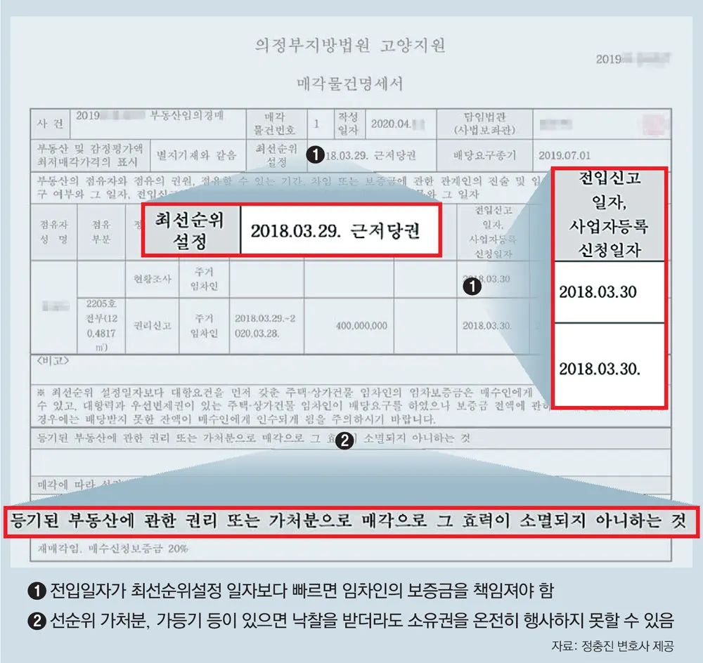 ‘최선순위설정일자’보다 임차인의 ‘전입신고일자’가 빠르다면, 낙찰자가 임차인의 보증금을 책임져야 할 수 있으니 각별한 주의가 필요합니다.